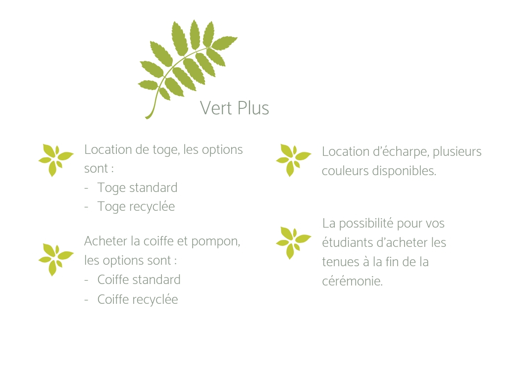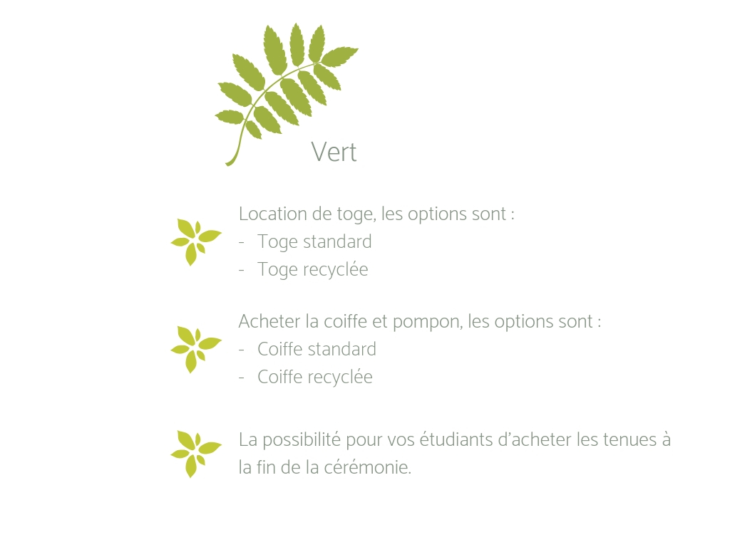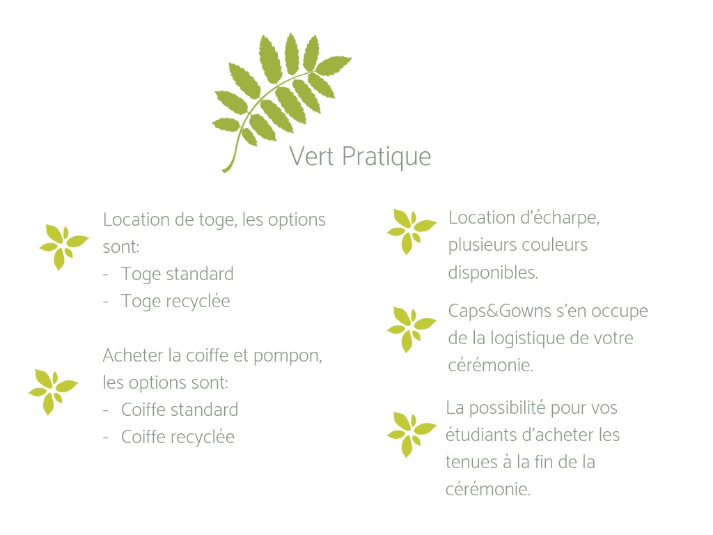 Go Green! Caps&Gowns a aussi des toges et coiffes recyclées à la location et à la vente. Les toges et coiffes sont 100% recyclées des bouteilles en plastique. Si vous choisissez nos produits recyclés vous assurez que: